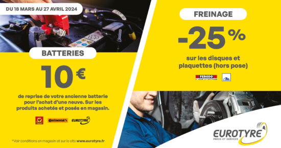 Il y a toujours une promo pneu intéressante avec Eurotyre ! Pneus pas cher pour un budget serré, cadeau exclusif, remboursement… notre réseau de garagistes tisse des partenariats avec les plus grandes marques.